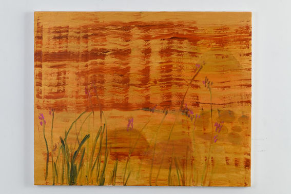 Do outro lado, temos obras em pequenos formatos, onde a paisagem propriamente dita é o gênero que dá o tom do conjunto. De forma mais sutil, uma poeira dourada também habita o conjunto. Paisagem, sempre a paisagem. Não importa se tais lugares existem ou se são pura ficção, fruto da imaginação da pintora. Não há um compromisso com o realismo, mas sim com a própria pintura. Aqui, vemos composições sem céu, mata densa, sobreposições, transparências, silhuetas que se formam com a retirada de tinta, manchas que viram flores e pedras, linhas que viram galhos, pinturas que flertam com o desenho. Figura e fundo por vezes se mesclam. Interessa o gesto inacabado que traz a sugestão das formas e convida quem vê a obra a completá-las em sua mente. Nelas, traços característicos da artista se fazem presentes, assim como a recorrência no uso de cores inusitadas, que não condizem com referentes da natureza.