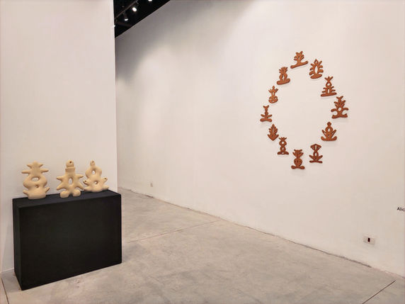 Por outro lado, descentralizando a espécie humana, estão as complexas relações interespécies e entre matéria orgânica e inorgânica, entrelaçando dimensões oníricas e imaginativas à linguagem científica. Formas curvas e suaves contrastam com a predominância geométrica da parede oposta. Com a precisão do fazer manual, entre técnicas do fazer cerâmico e inovações no uso do tecido e do papel, as artistas Fernanda Corsini, Desirée Feldmann, Laura Barzaghi e Alice Aroeira trazem visões de natureza que vão do micro ao macro, por vezes dando forma aos seres intangíveis que coabitam o nosso inconsciente.